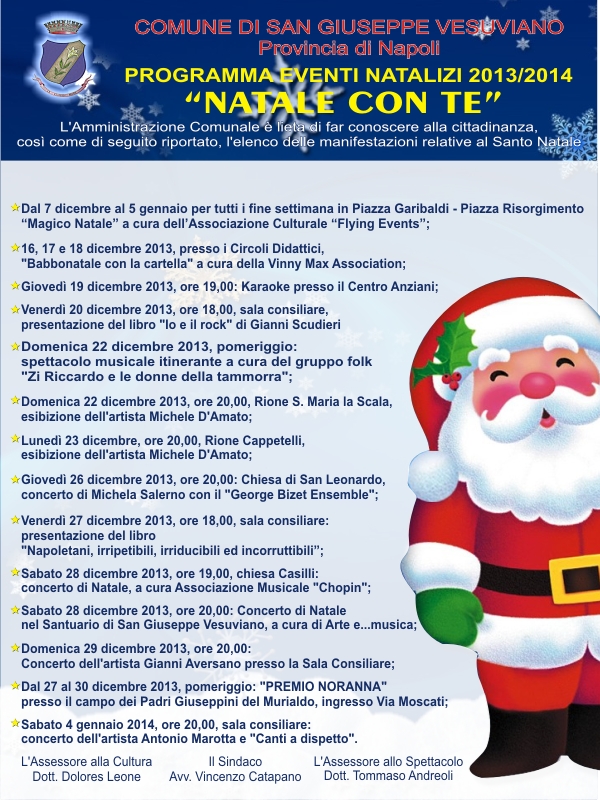 Online il programma degli eventi Natalizi 2013. Ecco il calendario delle manifestazioni che animeranno le prossime festività natalizie a San Giuseppe Vesuviano fino al giorno 5 di gennaio.