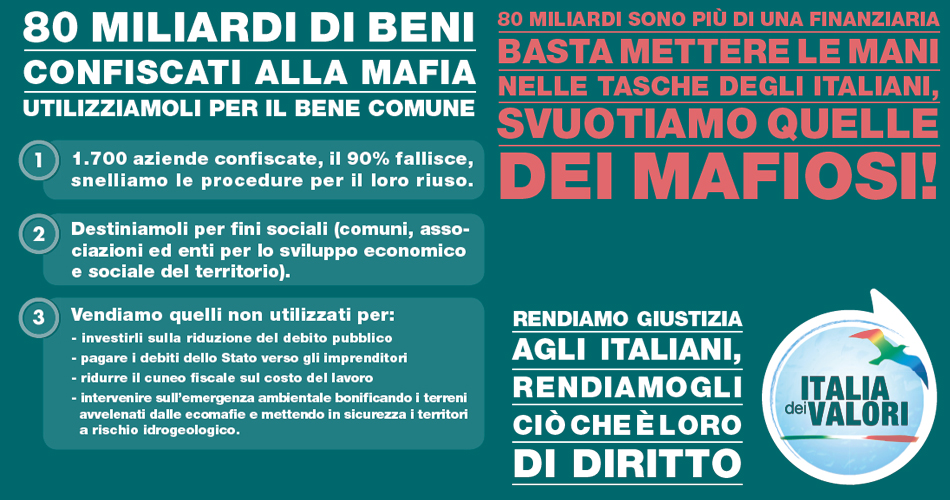Sono a disposizione, presso l'ufficio Elettorale del Comune di San Giuseppe Vesuviano, i moduli per firmare a favore della proposta di legge d'iniziativa popolare promossa da Italia dei Valori "VENDITA BENI CONFISCATI ALLA MAFIA"