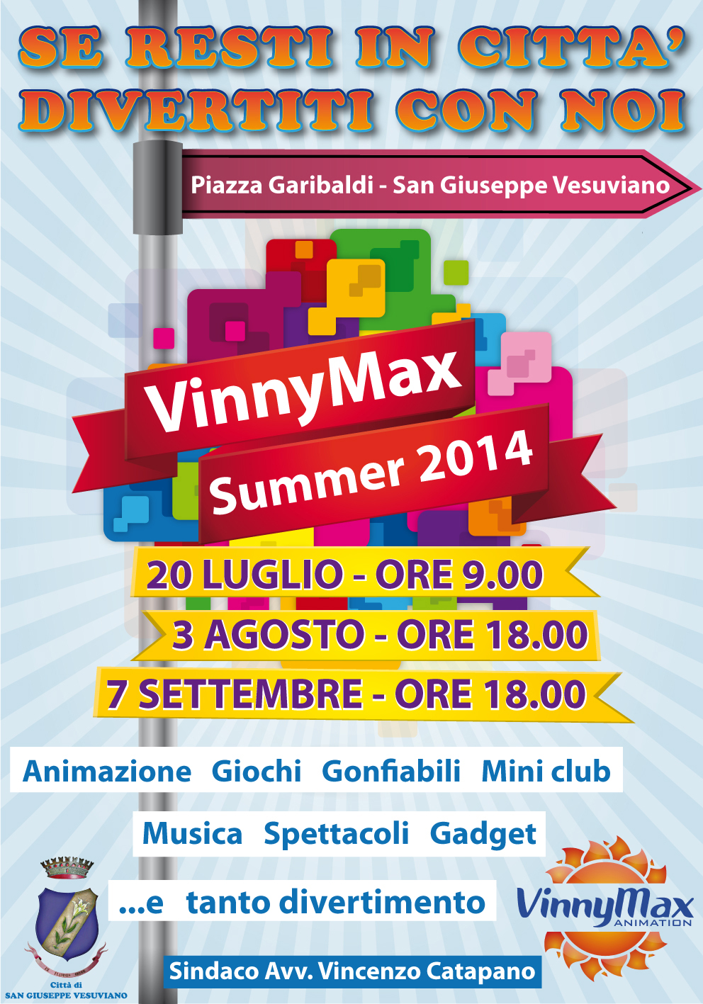 La VinnyMax animation, col patrocinio del Comune di San Giuseppe Vesuviano, presenta l'iniziativa “VinnyMax SUMMER 2014 – SE RESTI IN CITTA' DIVERTITI CON NOI”, pensata appositamente per ravvivare i pomeriggi estivi di chi decide di rimanere nel proprio paese. L'evento si terrà nei giorni del 3 agosto e dell'8 settembre, sempre a partire dalle ore 18:00, in Piazza Garibaldi. Per l'occasione in questione, la VinnyMax animation allestirà una serie di giochi gonfiabili e un mini club per i più piccoli, oltre a numerosi spettacoli d'animazione all'insegna della musica e del divertimento. Nel corso degli eventi saranno inoltre distribuiti simpatici gadget agli spettatori presenti.