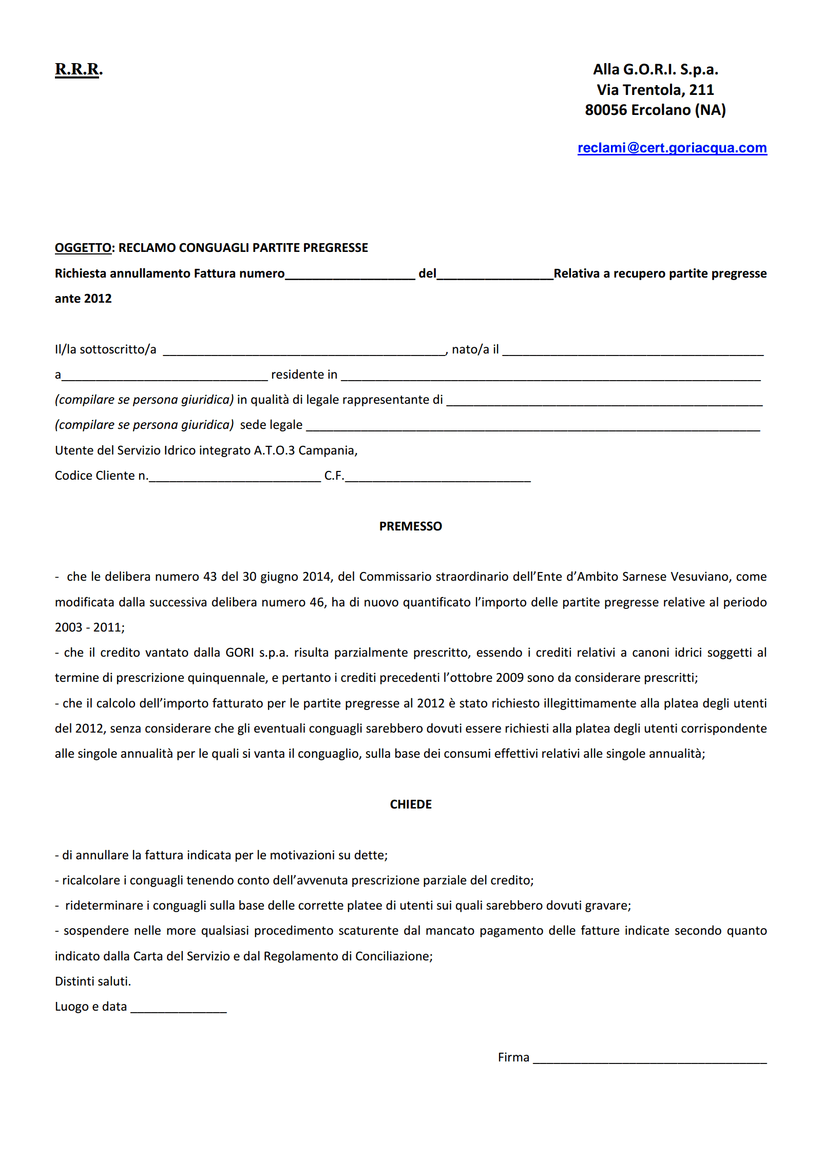 In allegato i cittadini possono trovare il modulo per inoltrare reclamo avverso le suddette fatture