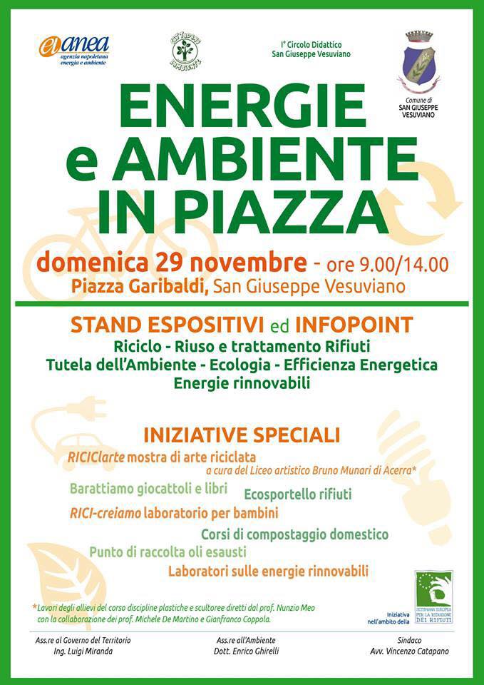 Domenica 29 Novembre(Piazza Garibaldi, 9.00/14.00), il Comune di San Giuseppe Vesuviano ha organizzato, in collaborazione con l’ANEA (Agenzia Napoletana Energia e Ambiente), con l'Associazione Cittadini per l’Ambiente e il I° Circolo Didattico "San Giuseppe Vesuviano", la giornata “Energie e Ambiente in Piazza”.
