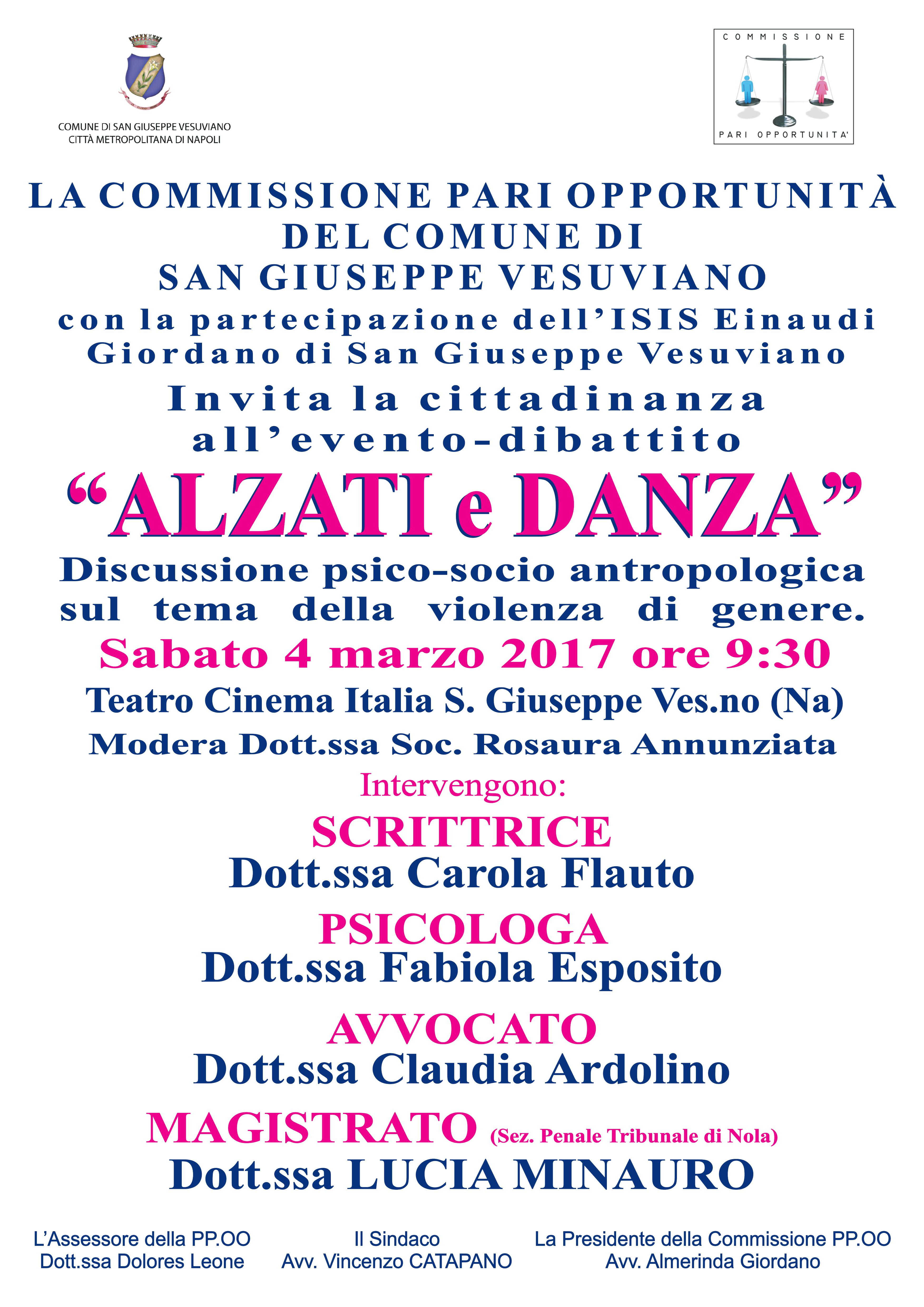 Sabato 4 marzo 2017, alle ore 9:30, il Cinema Teatro Italia di San Giuseppe Vesuviano ospiterà l'evento-dibattito "Alzati e Danza", una discussione psico-socio antropologica sul tema della violenza di genere. L'evento è promosso dal Comune di San Giuseppe Vesuviano e dalla Commissione Pari Opportunità, in collaborazione con le scuole del territorio ed, in particolare, con l'I.S.I.S. Einaudi – Giordano.