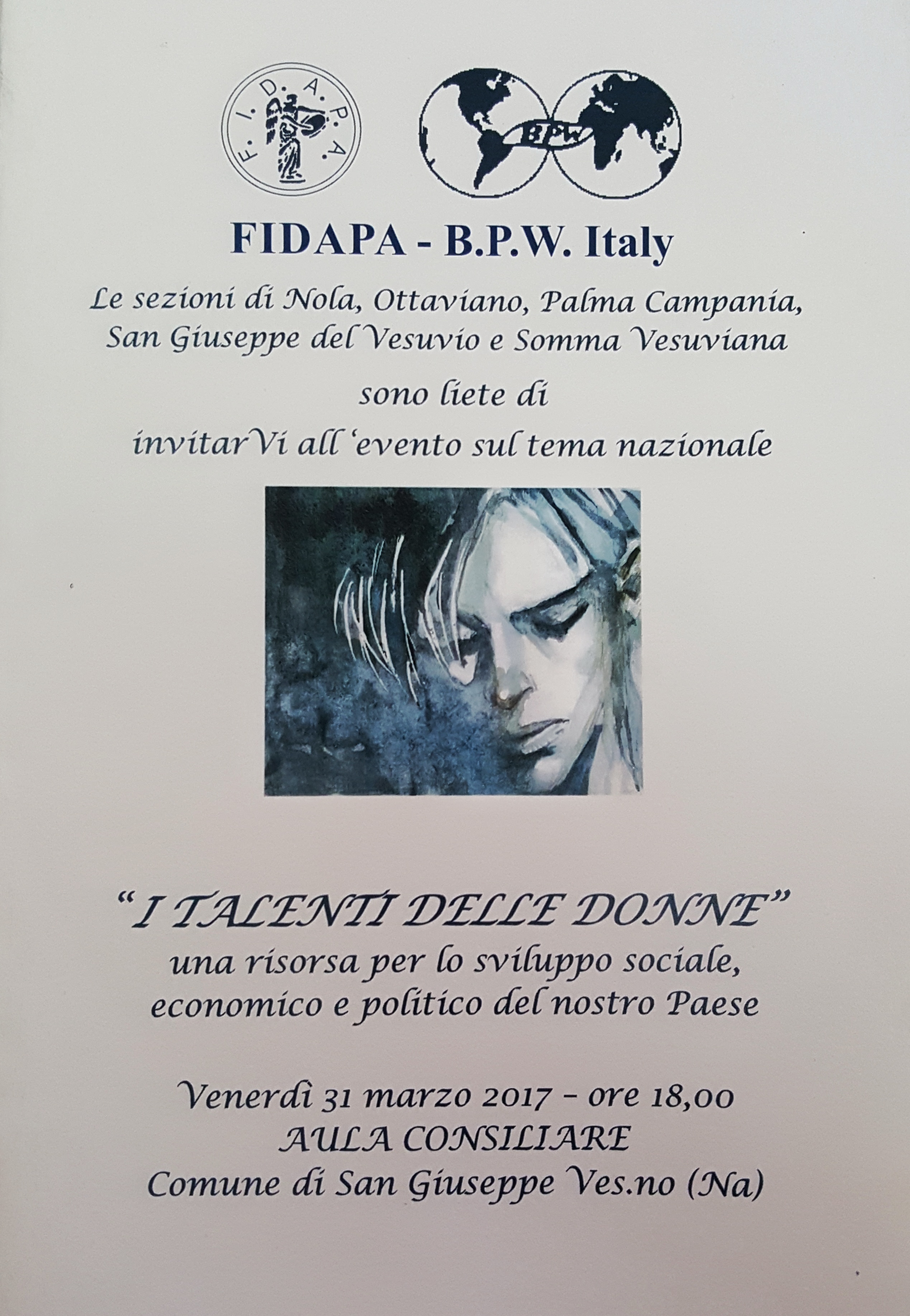 Venerdì 31 marzo 2017, alle ore 18:00, la Sala Consiliare del Comune di San Giuseppe Vesuviano ospiterà “I talenti delle donne”, evento promosso dalla FIDAPA – BPW Italy e patrocinato dal Comune di San Giuseppe Vesuviano. Un'occasione per aprire un'ulteriore finestra sul mondo femminile e per discutere dell'importante ruolo che le donne rivestono nello sviluppo sociale, economico e politico del Paese.
