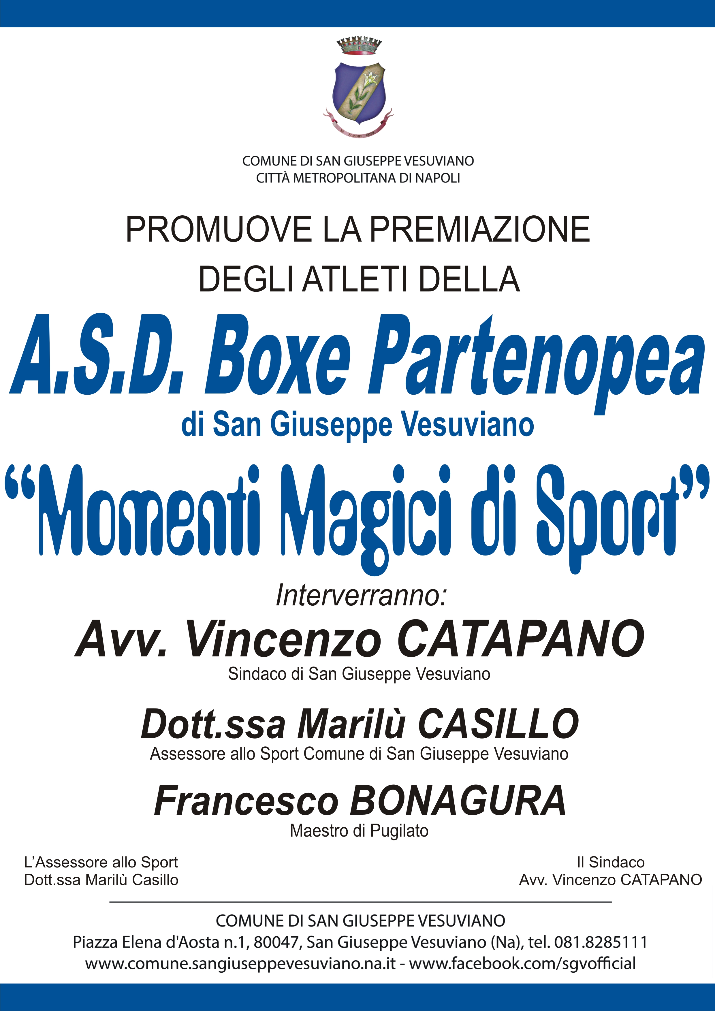 Giovedì 13 aprile 2017, alle ore 18:30, la Sala Consiliare del Comune di San Giuseppe Vesuviano, ospiterà “Momenti magici di sport”, la cerimonia di premiazione degli atleti dell'A.S.D. Boxe Partenopea che hanno trionfato nei tornei e nei campionati regionali e nazionali di pugilato.