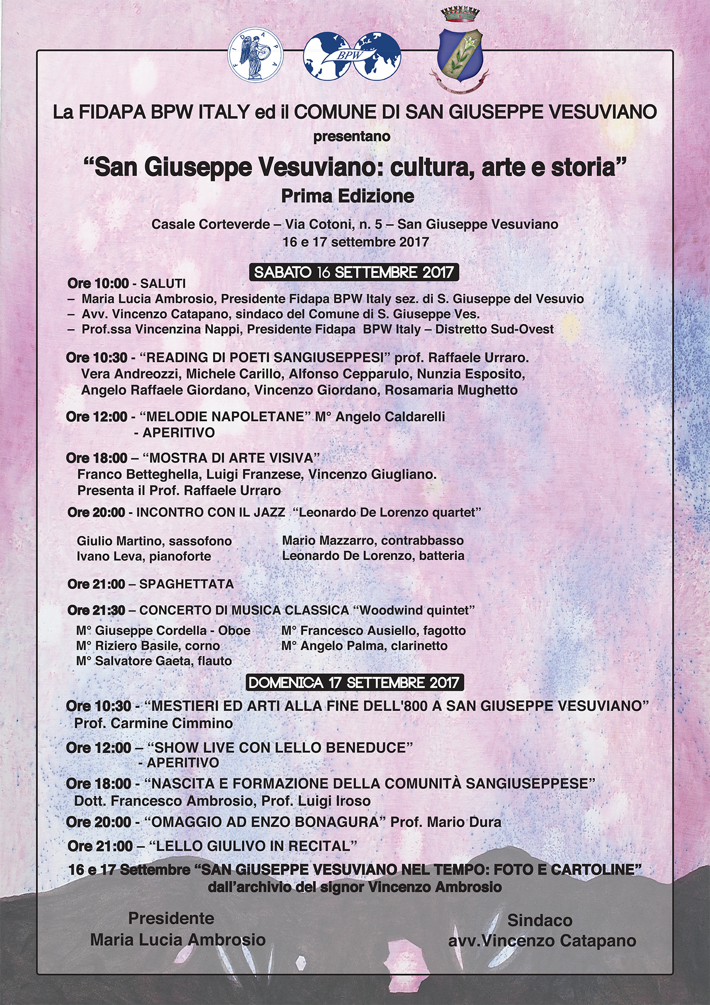 Si inizia sabato 16 settembre, alle ore 10:00, con i saluti istituzionali del Sindaco, avv. Vincenzo Catapano, di Maria Lucia Ambrosio, presidente della FIDAPA BPW ITALY, sezione di San Giuseppe Vesuviano, e di Vincenzina Nappi, Presidente della FIDAPA BPW ITALY – Distretto Sud Ovest. Alle ore 10:30 si entrerà nel vivo dell'incontro con un “reading di poeti sangiuseppesi” curato dal Prof. Raffaele Urraro. Alle ore 12:00, poi, il Maestro Angelo Caldarelli presenterà un momento musicale “melodie napoletane”, a cui seguirà un momento conviviale di aperitivo.
