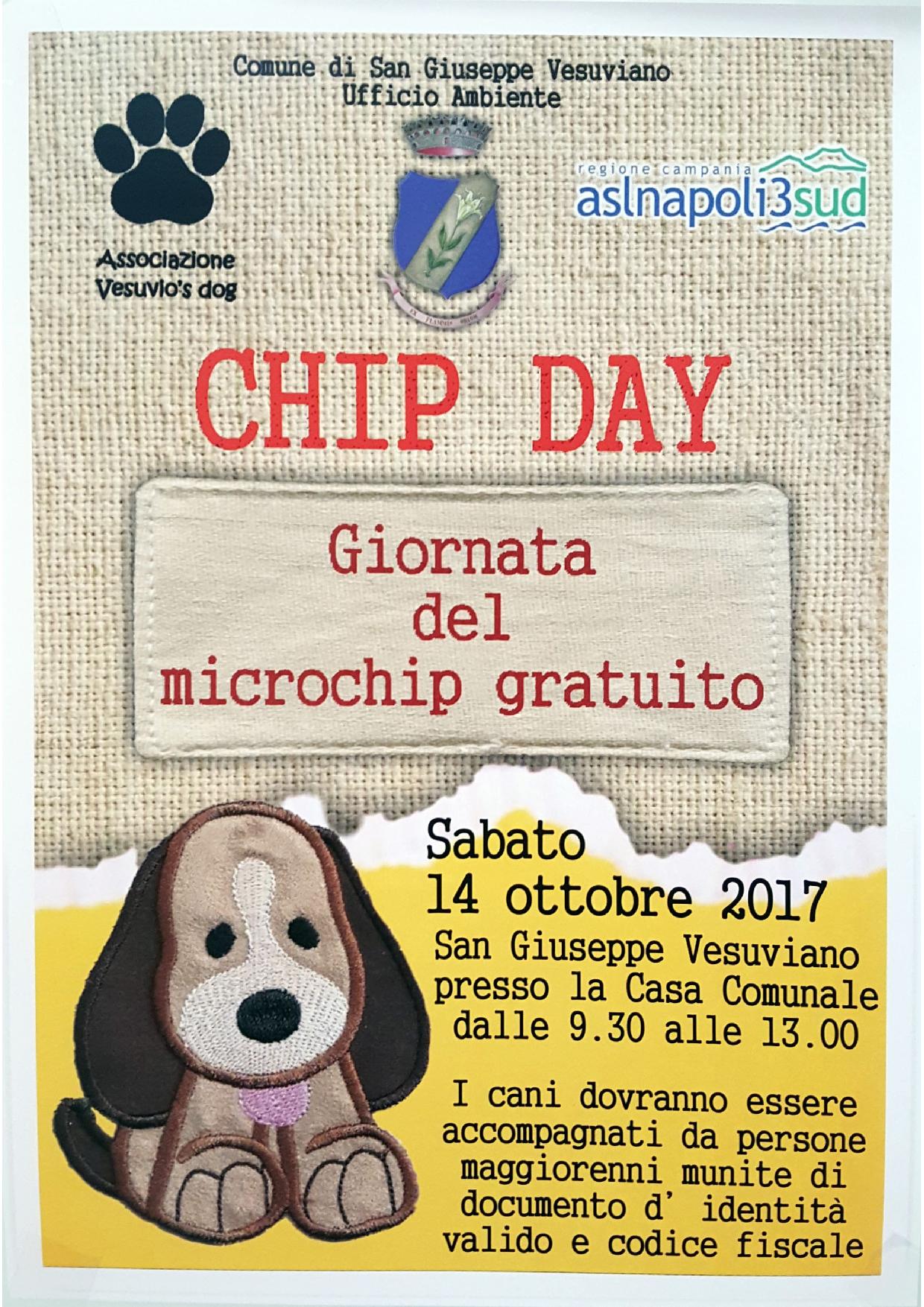 L’Ufficio Ambiente del Comune di San Giuseppe Vesuviano, in collaborazione con l’Associazione “Vesuvio’s dog” e con l’A.S.L. Napoli 3 Sud, promuove il “Chip Day”, la giornata del microchip gratuito, in cui i cittadini potranno, con l’ausilio di un veterinario abilitato, dotare di microchip il proprio cane.