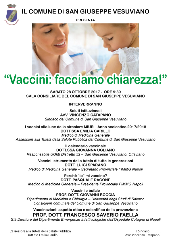 La Sala Consiliare del Comune di San Giuseppe Vesuviano ospiterà, domani 28 ottobre 2017, alle ore 9:30, il dibattito medico scientifico “Vaccini: facciamo chiarezza!”.