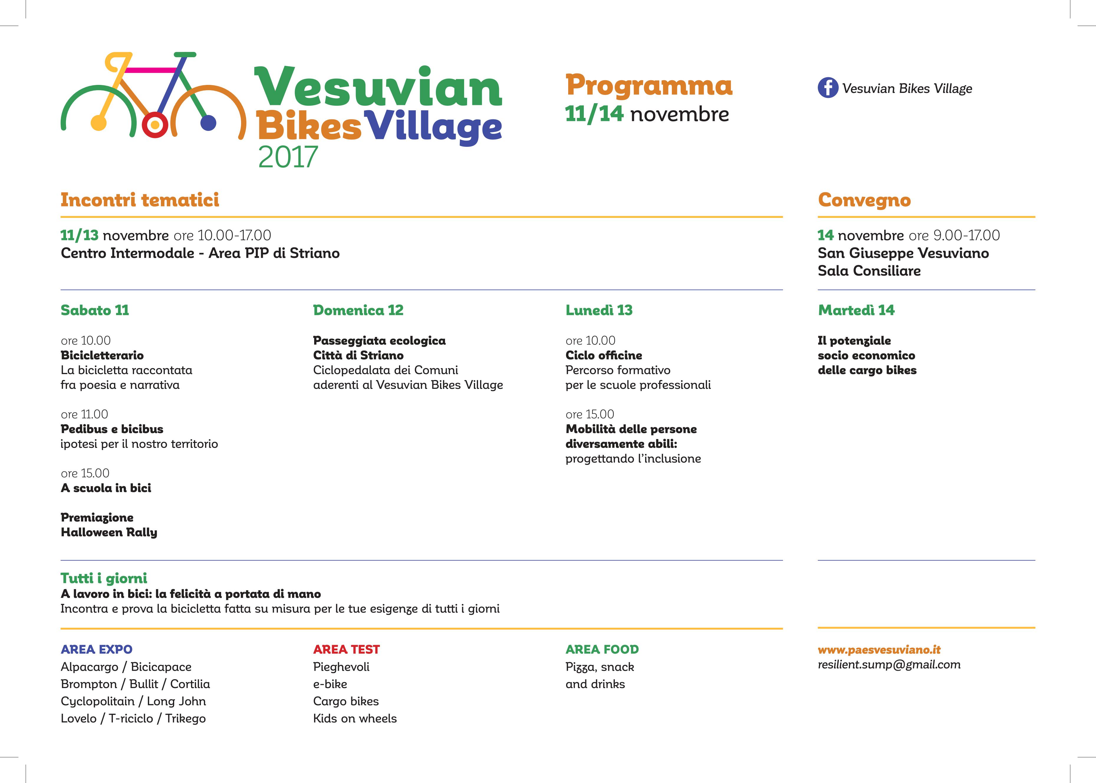 Martedì 14 novembre, dalle ore 9:00 alle ore 17:00, la conclusione del “Vesuvian Bikes Village 2017” presso la Sala Consiliare del Comune di San Giuseppe Vesuviano. Ospiti graditi saranno il direttore dell’International Cargo Bike Festival, Mr. Jos Sluijdsmans, l’addetto stampa dell’Ambasciata Olandese a Roma, Mr. Aart Heering, i sig. Diego Brunello, Ermens Ros, Milo Cargnelli e Valerio Vitelli che racconteranno l'utilizzo della bici in alcune esperienze italiane. Ad accogliere gli esperti ci saranno il Sindaco Vincenzo Catapano e l’Assessore al Governo del Territorio Luigi Miranda