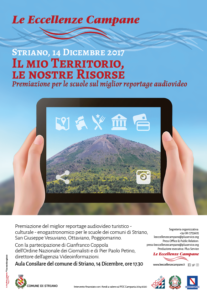 I lavori realizzati dagli studenti appartenenti alle diverse istituzioni scolastiche presenti nei territori dei Comuni in partnership, di cui San Giuseppe Vesuviano è capofila, saranno presentati giovedì 14 dicembre 2017, alle ore 17:30, presso la Sala Consiliare del Comune di Striano, ove si svolgerà anche la premiazione dei migliori reportage partecipanti al concorso "Il mio territorio, le nostre risorse".