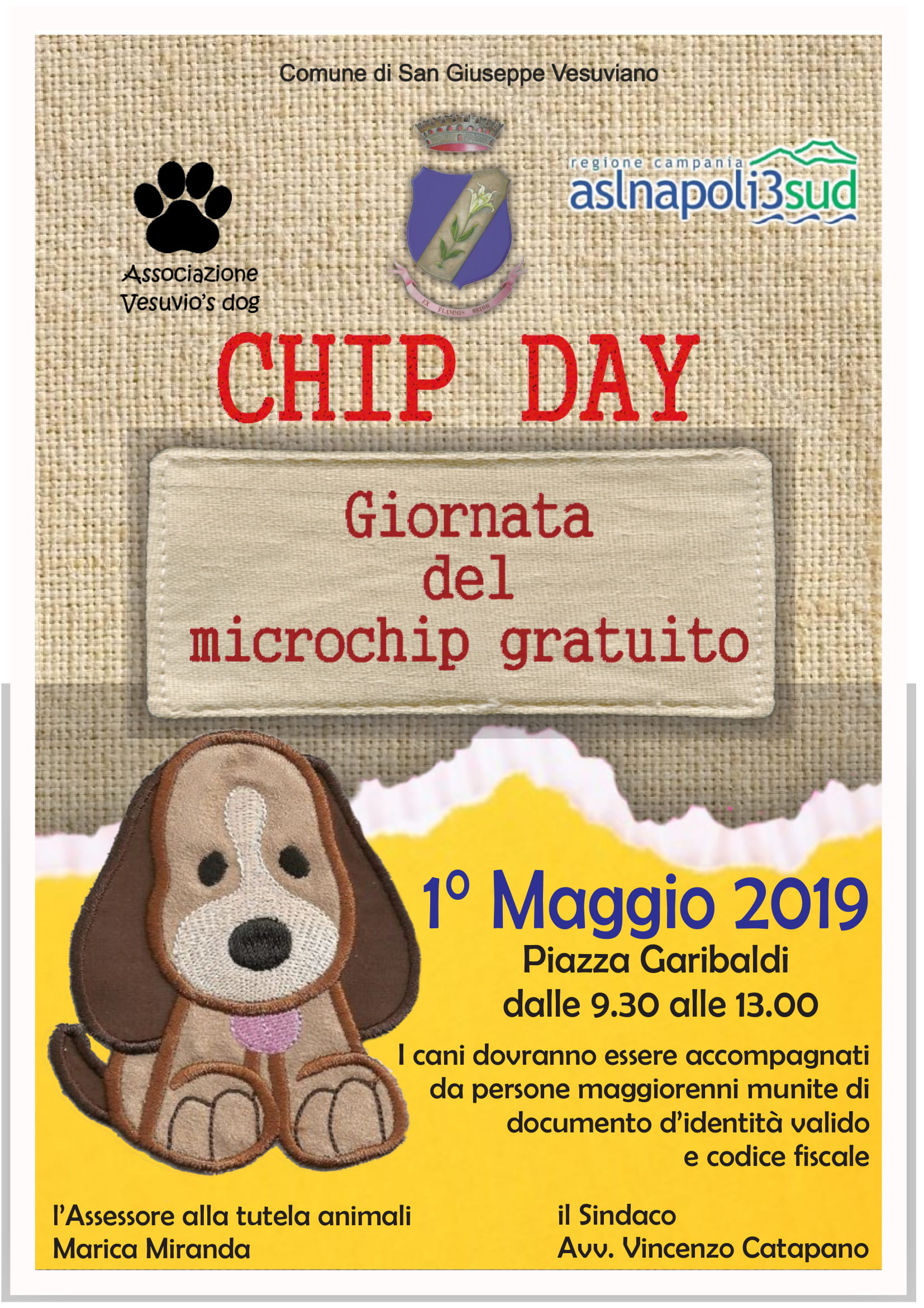 Il Comune di San Giuseppe Vesuviano, in collaborazione con l’Associazione “Vesuvio’s dog” e con l’A.S.L. Napoli 3 Sud, promuove il “Chip Day”, la giornata del microchip gratuito, in cui i cittadini potranno, con l’ausilio di un veterinario abilitato, dotare di microchip il proprio cane. L’evento si svolgerà mercoledì 1 maggio 2019, in piazza Garibaldi, dalle ore 9:30 alle ore 13:00. Gli animali dovranno essere accompagnati da persone maggiorenni, munite di valido documento di identità e codice fiscale.