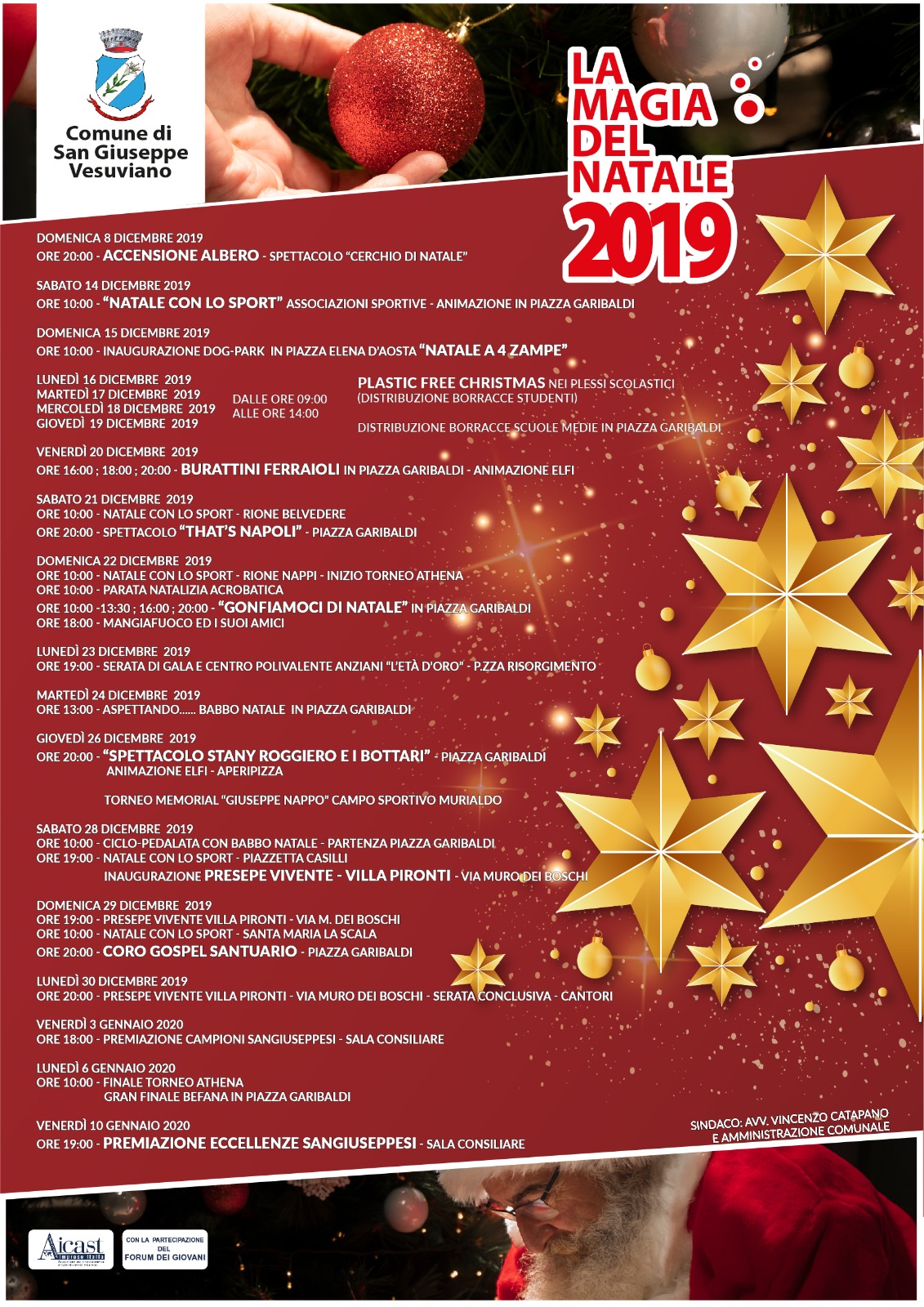 Il Natale a San Giuseppe Vesuviano inizia, quest’anno, domenica 8 dicembre, con l’accensione dell’albero di Natale in piazza Garibaldi, alle ore 20:00, preceduta dallo spettacolo “Cerchio di Natale” .
