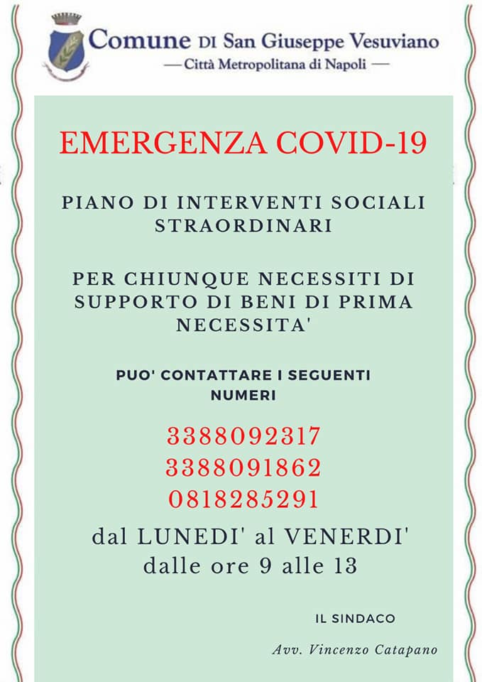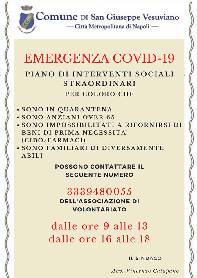 - Chiunque necessiti di supporto e beni di prima necessità, contatti i Servizi Sociali del Comune di San Giuseppe Vesuviano ai recapiti 0818285291, 3388092317, 3388091862. Gli assistenti sociali, a seguito di un preliminare screening, valuteranno la sussistenza dei presupposti per la presa in carico e per il sostegno.